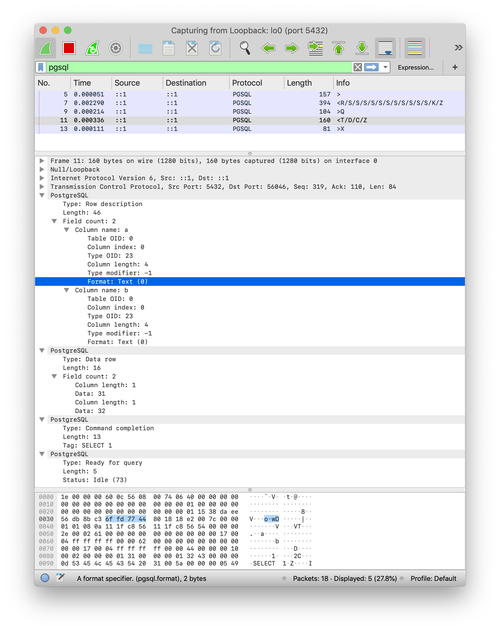 Wireshark内建了对PGSQL的解码,允许我们方便地查看PostgreSQL协议报文的内容。