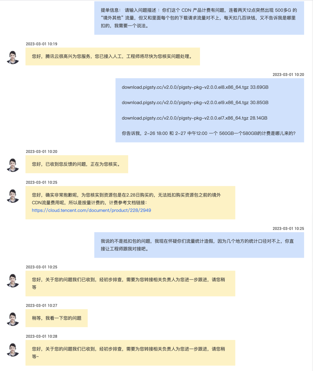 腾讯云 CDN则不然,一个1MB/1GB的软件包预热,每个终端节点直接来请求,产生 1TB 的“预热流量”。八毛钱1GB 流量费,几百块就没了。更滑稽的是,我 CDN 是给大陆用户使用的,墙外用户根本用不着,直接 Github 下载就好了,而这些流量全都跑到“境外”去了,事先买好境内的流量包压根不能抵扣。而腾讯云的文档上也压根没有提及,这些 “预热” 究竟有多大的量和来自哪里。我认为,这已经构成了事实上的欺诈与恶意引导杀猪盘。比 《云数据库是不是智商税》还要恶劣的多。