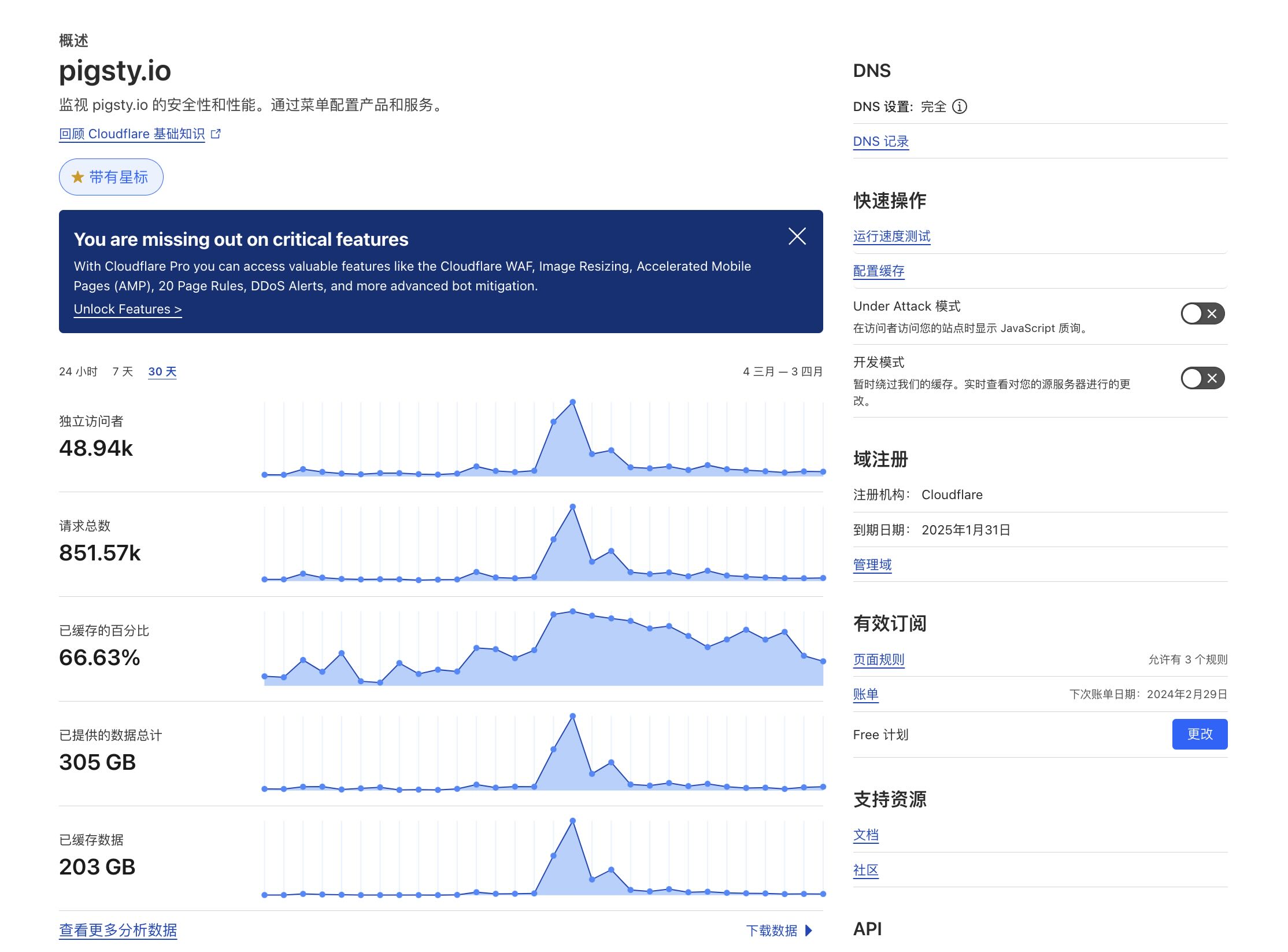我从完全没接触过 Cloudflare,到把 Pigsty 的网站搬运到 CF 上并完成部署,只用了一个小时左右。我不需要操心什么服务器,CI/CD / HTTPS 证书,安全高防抗 DDoS,Cloudflare 已经把一切都替我做好了 —— 更重要的是流量费全免,我唯一做的就是绑了个信用卡花了十几块钱买了个域名,但实际上根本不需要什么额外费用 —— 都已经包含在免费计划中了。