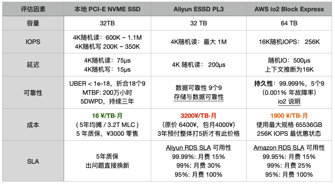 说到底,用户在意的不是设备块底下到底是 SAN,SSD,还是HDD;真正重要的永远是实打实的硬指标:延迟、IOPS,可靠性,成本。拿本地与云上的最好选项对比,没有任何问题,更别提最好的云存储底下用的也是一样的本地盘了。