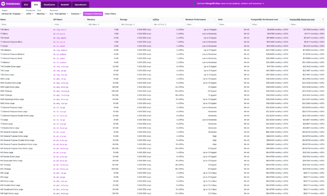 以 AWS RDS 报价为例可以看出,1核2核的迷你机型,单价也就是 几$/核·月,折合三四百块人民币一年,可以说是非常便宜实惠(不含存储):如果你需要一个低频使用的小微数据库放点东西,这也许就是最简单便宜的选择【10】。