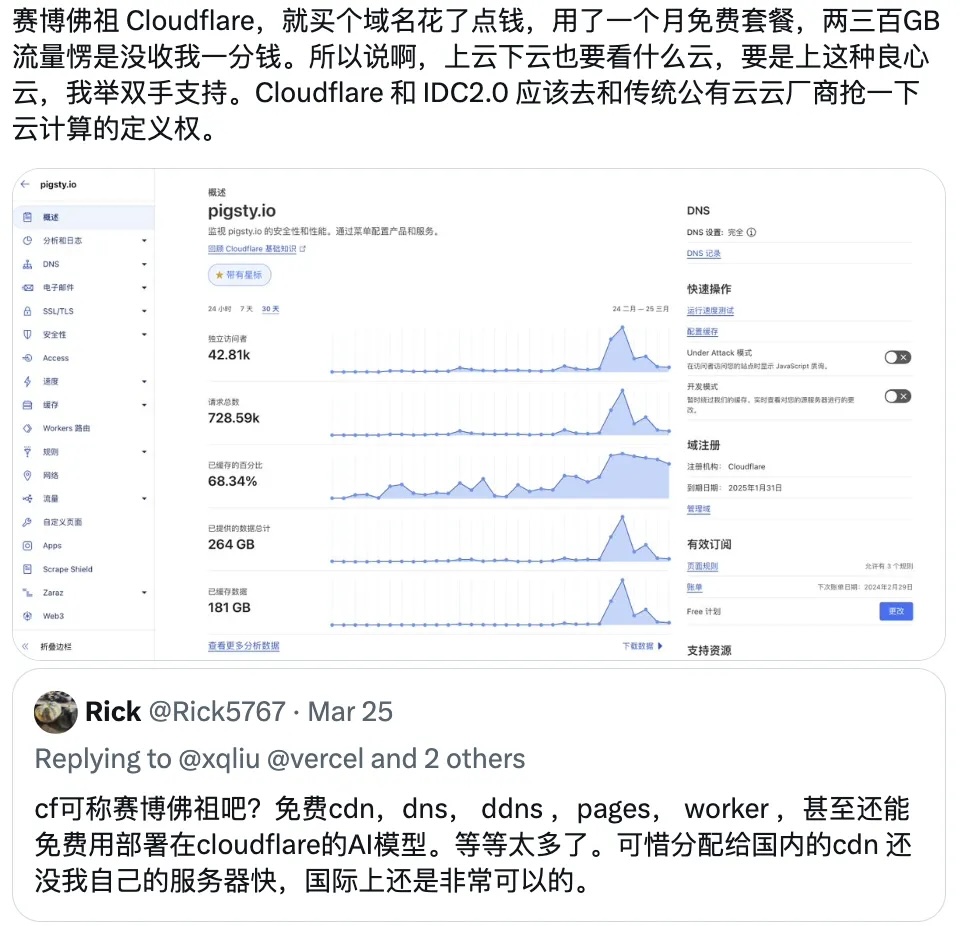 另一种 ToC 的典型场景是学生和个人站长。在以前,个人站长拿个 2C 2G 3M带宽的小虚拟机弄个网站还是挺不错的 —— 但是自从有了赛博佛祖 Cloudflare,别说 99 块钱的云服务器了,9块9 都不香了 —— 再便宜能便宜过免费吗? —— 何况用 CF 建站的体验比云服务器要好太多了 —— 都不用说各种Free Plan,就凭流量免费这一点,就足以让“送的几兆带宽”都统统变垃圾……