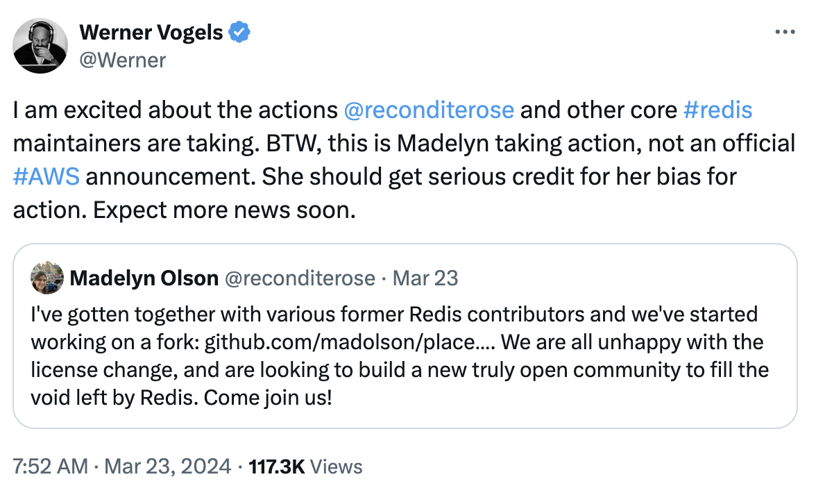 当 Redis 宣布更改协议后,马上就有 AWS 员工跳出来 Fork Redis —— “Redis 不开源了,我们的分叉才是真开源!” 然后 AWS CTO 出来叫好,并假惺惺的说:这是我们员工的个人行为 —— 堪称是现实版杀人诛心。