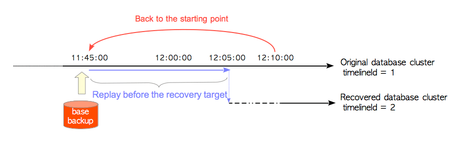 参数recovery_target_time被设置为您犯下新错误的时间,而recovery_target_timeline被设置为2,以便沿着这条时间线恢复。