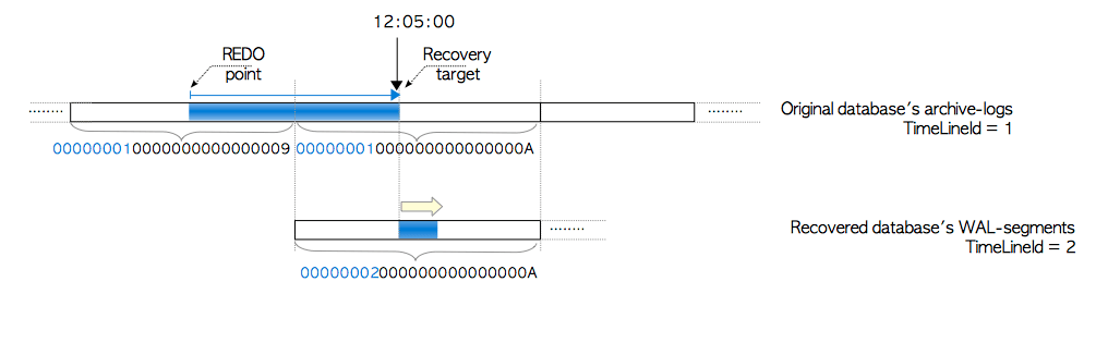 通过这种方式,每个时间线历史文件都会告诉我们每个恢复所得的数据库集簇的完整历史。二期它也在PITR过程中也有使用。下一节将描述具体细节。