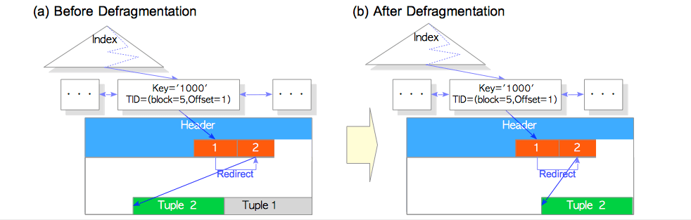 堆内元组(HOT)功能消除了冗余索引条目,并允许在不进行表级清理的前提下,重用被删除或被更新的元组空间。这是通过单页清理 实现的,也称为碎片整理(defragmentation)。