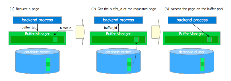 buffer_tag返回一个buffer_id,即目标页面存储在数组中的槽位的序号。如果请求的页面没有存储在缓冲池中,那么缓冲区管理器会将页面从持久存储中加载到其中一个缓冲池槽位中,然后再返回该槽位的buffer_id。 - 后端进程访问
