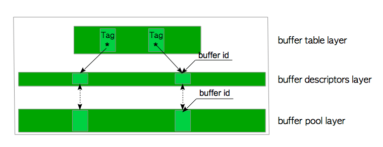 **缓冲区描述符(buffer descriptors)**层是一个由缓冲区描述符组成的数组。 每个描述符与缓冲池槽一一对应,并保存着相应槽的元数据。请注意,术语“缓冲区描述符层”只是在本章中为方便起见使用的术语。