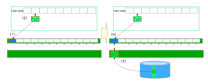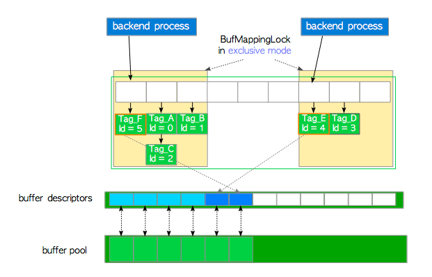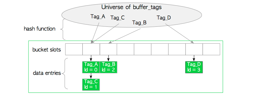 数据项包括两个值:页面的buffer_tag,以及包含页面元数据的描述符的buffer_id。例如数据项Tag_A,id=1 表示,buffer_id=1对应的缓冲区描述符中,存储着页面Tag_A的元数据。