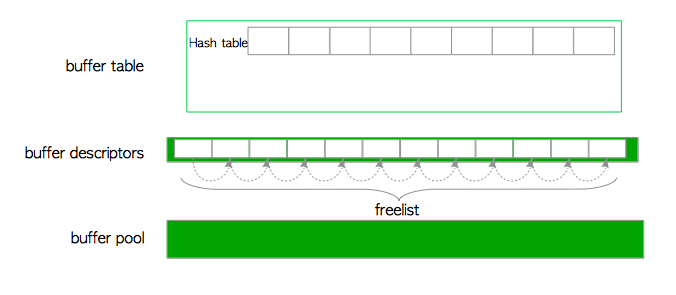 PostgreSQL缓冲区管理器由三层组成,即缓冲表层,缓冲区描述符层和缓冲池层(图8.3):