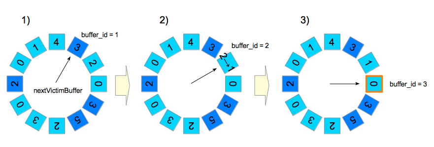 nextVictimBuffer指向第一个描述符(buffer_id = 1);但因为该描述符被钉住了,所以跳过。extVictimBuffer指向第二个描述符(buffer_id = 2)。该描述符未被钉住,但其usage_count为2;因此该描述符的usage_count将减1,而nextVictimBuffer迭代至第三个候选描述符。nextVictimBuffer指向第三个描述符(buffer_id = 3)。该描述符未被钉住,但其usage_count = 0,因而成为本轮的受害者。