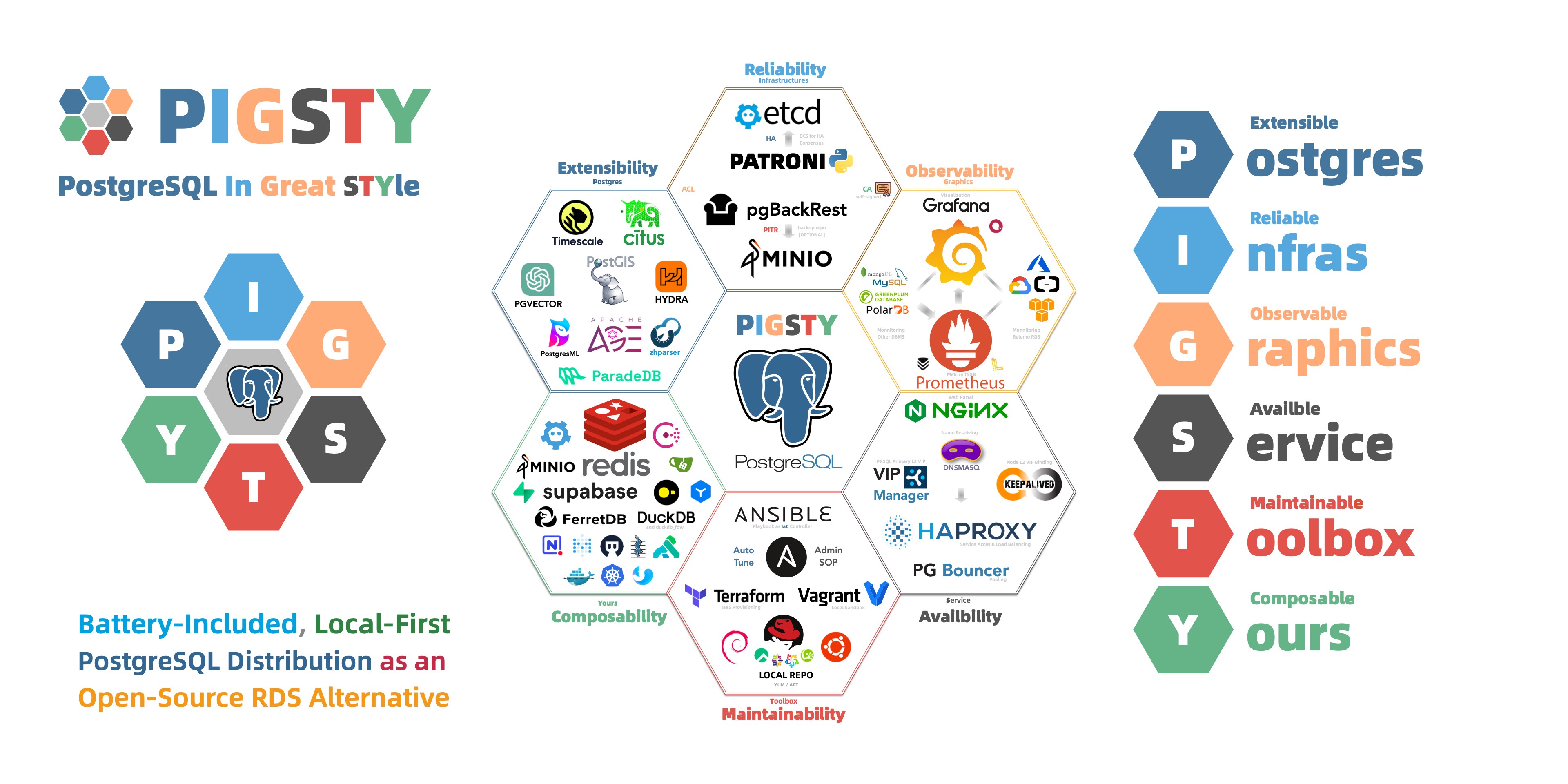 Pigsty 是 PostgreSQL in Great STYle 的缩写,意为 PostgreSQL 的全盛状态。