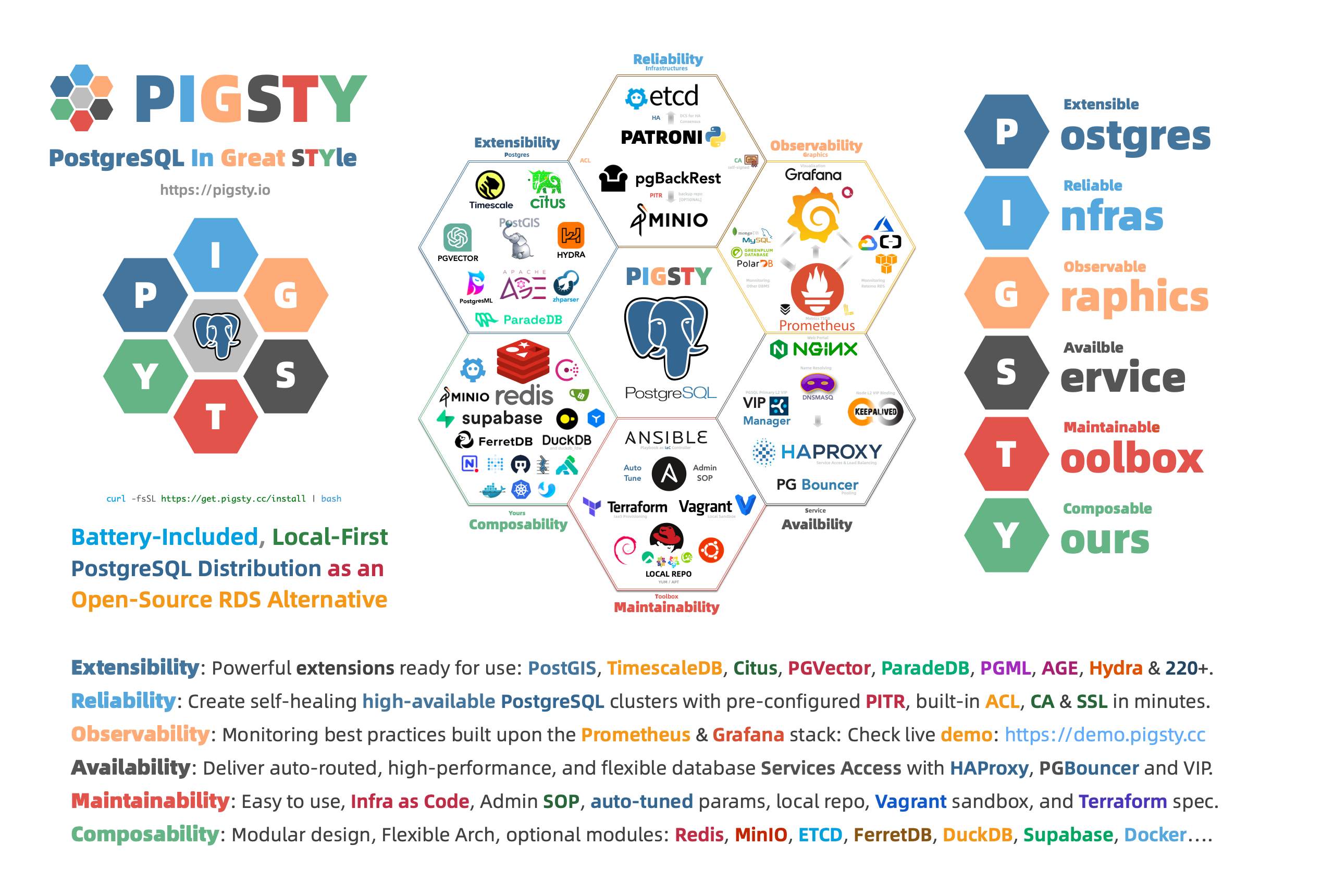 所以我打造了 Pigsty —— 一个开箱即用的开源 PostgreSQL 数据库发行版,旨在凝聚 PostgreSQL 生态扩展的合力,并把提供优质数据库服务的能力普及到每个用户手中。
