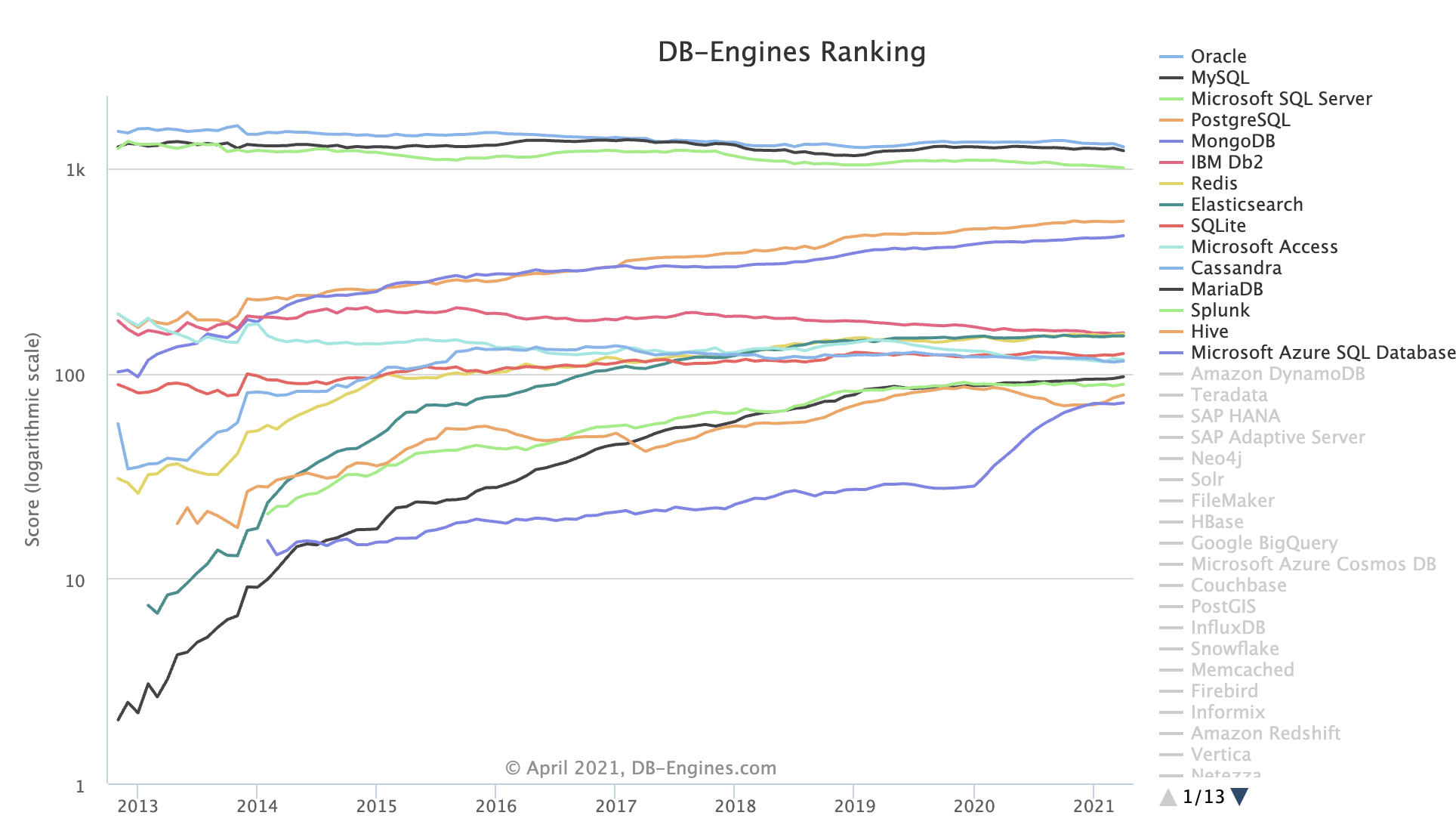 DB-Engine 数据库流行度趋势 (注意这是对数坐标系)