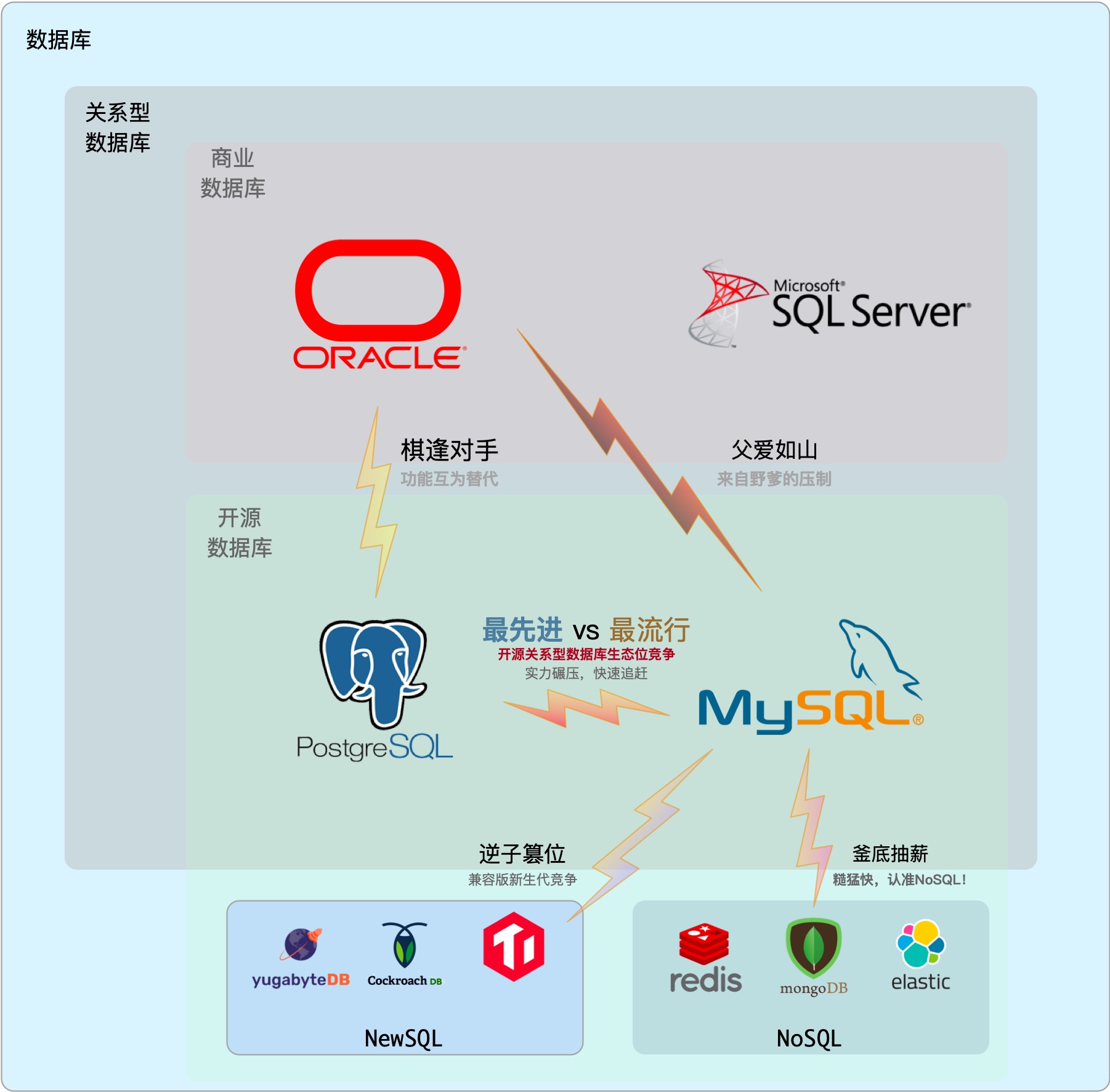 关系型数据库的生态位高度重叠,其关系可以视作零和博弈。与PostgreSQL形成直接竞争关系的,就是Oracle与MySQL。