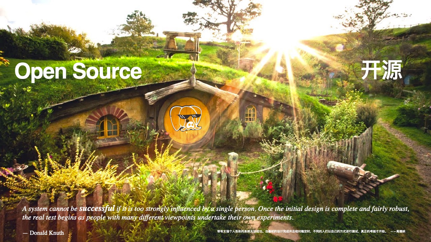 不过,正如高德纳所说:“带有太强个人色彩的系统无法成功”。 要想让Pigsty成为一个具有旺盛生命力的项目,就必须开源,让更多的人用起来。“当最初的设计完成并足够稳定后,各式各样的用户以自己的方式去使用它时,真正的挑战才刚刚开始”。