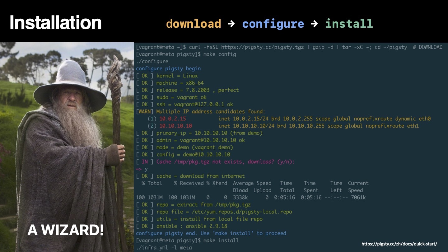 Pigsty的部署分为三步:下载源码,配置环境,执行安装,均可通过一行命令完成。遵循经典的软件安装模式,并提供了配置向导。您需要准备的只是一台CentOS7.8机器及其root权限。管理新节点时,Pigsty基于Ansible通过ssh发起管理,无需安装Agent,即使是新手也可以轻松完成部署。
