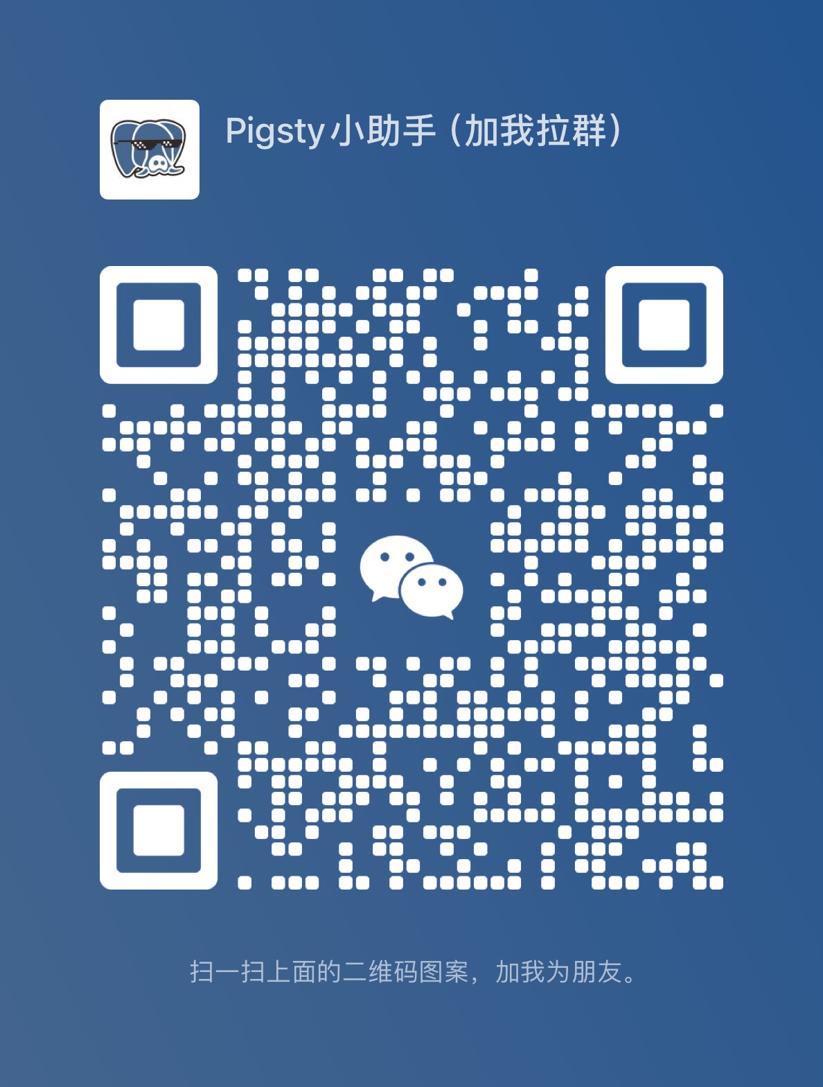 加入微信社群,请用搜索 “Pigsty小助手”,(微信号 pigsty-cc) 备注或发送 “加群” ,小助手会将您拉入群组中。