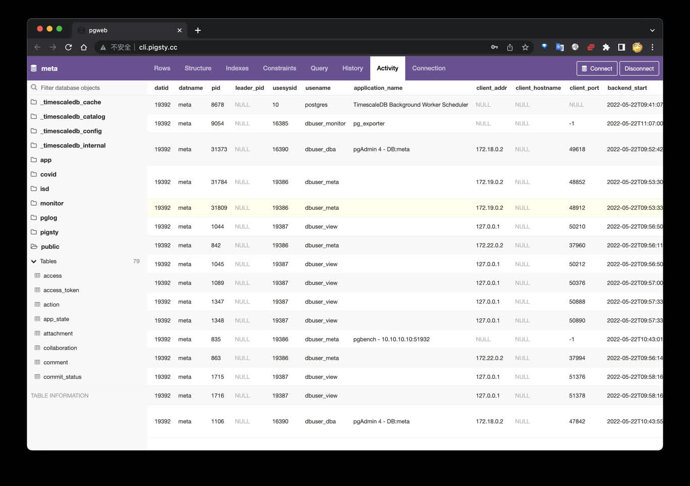 PGWeb是一款基于浏览器的PG客户端工具,使用以下命令,在元节点上拉起PGWEB服务,默认为主机8886端口。可使用域名: http://cli.pigsty 访问,公开Demo:http://cli.pigsty.cc。